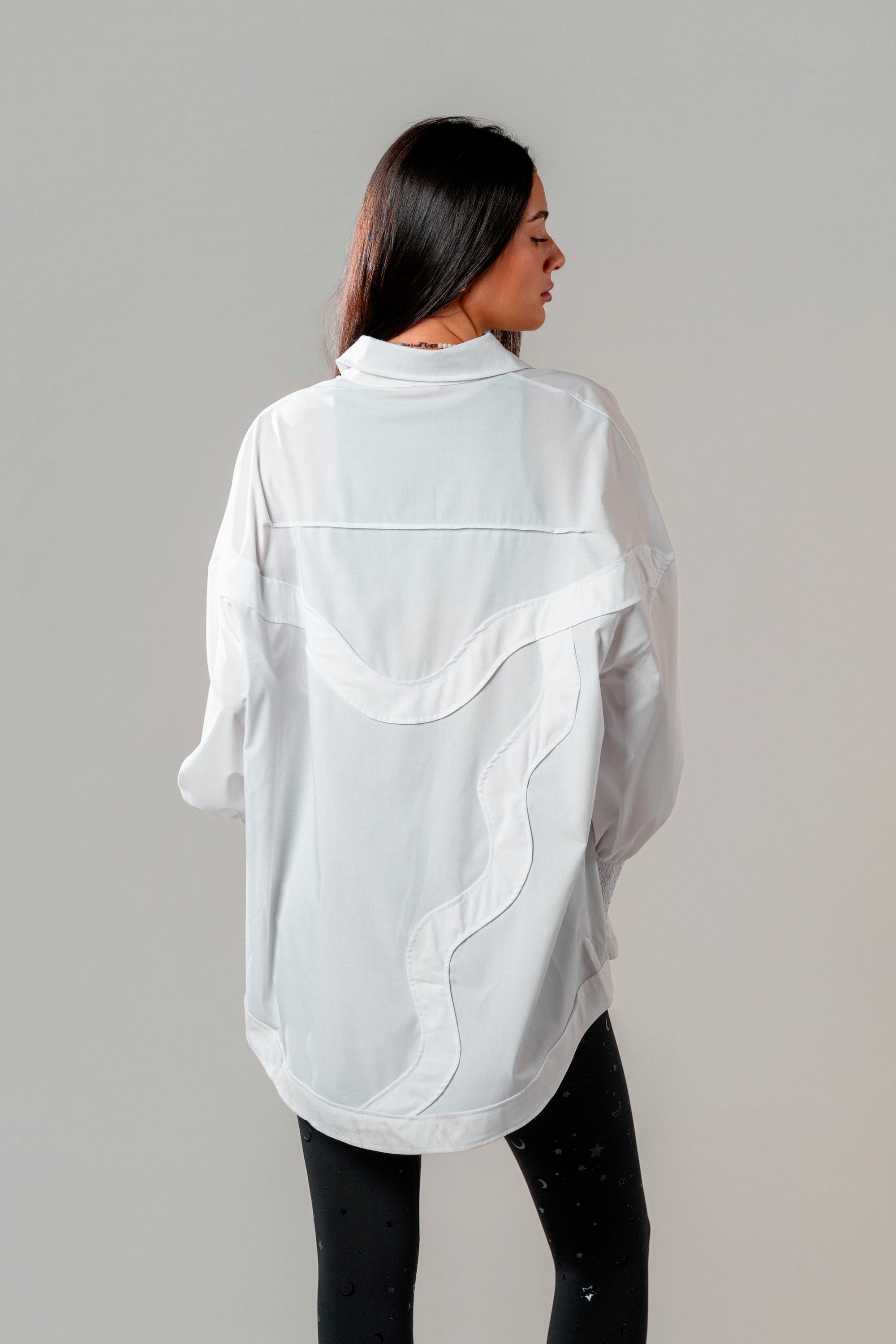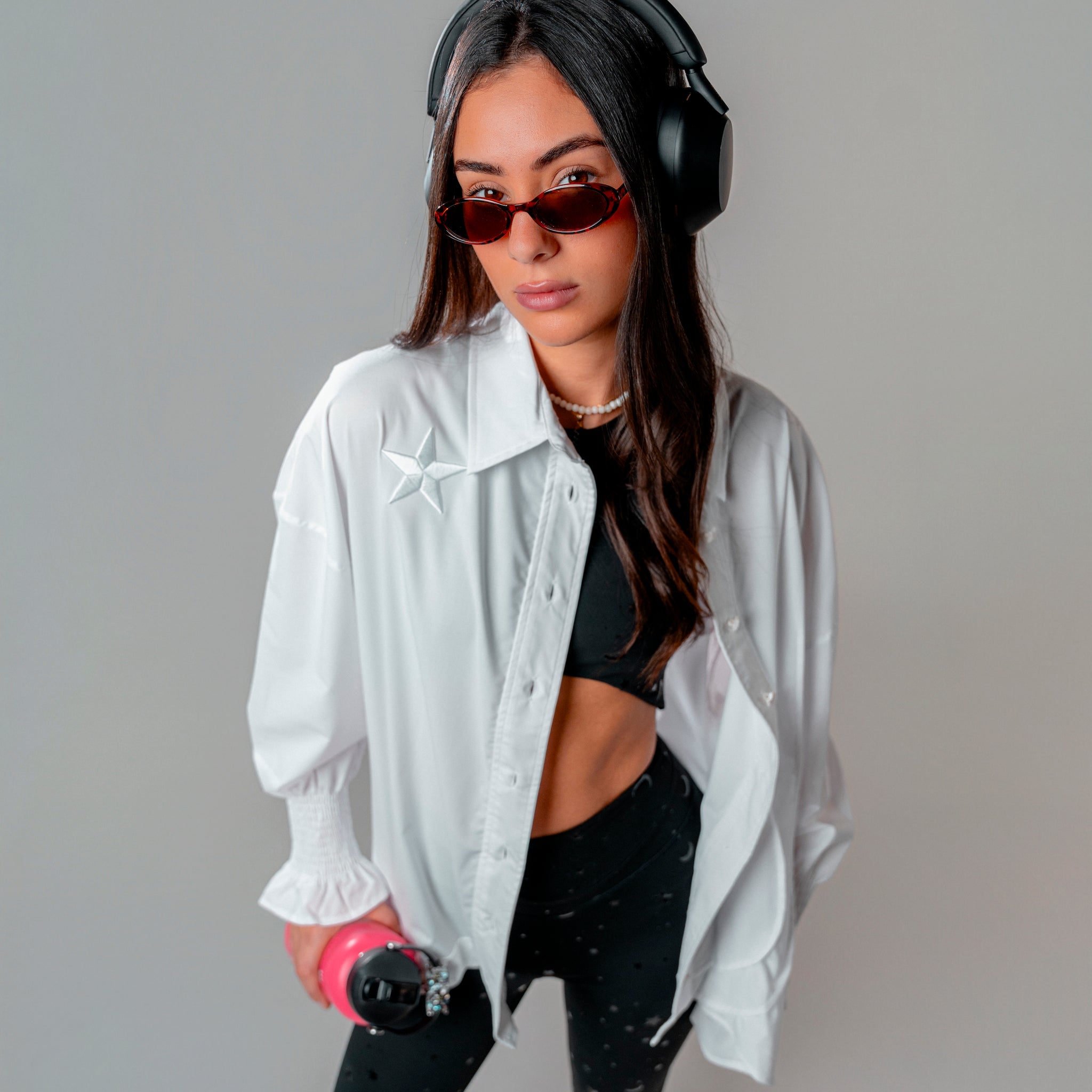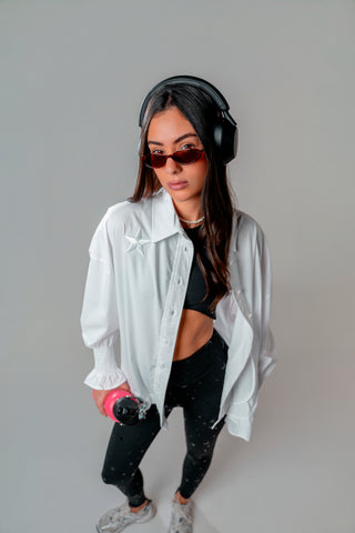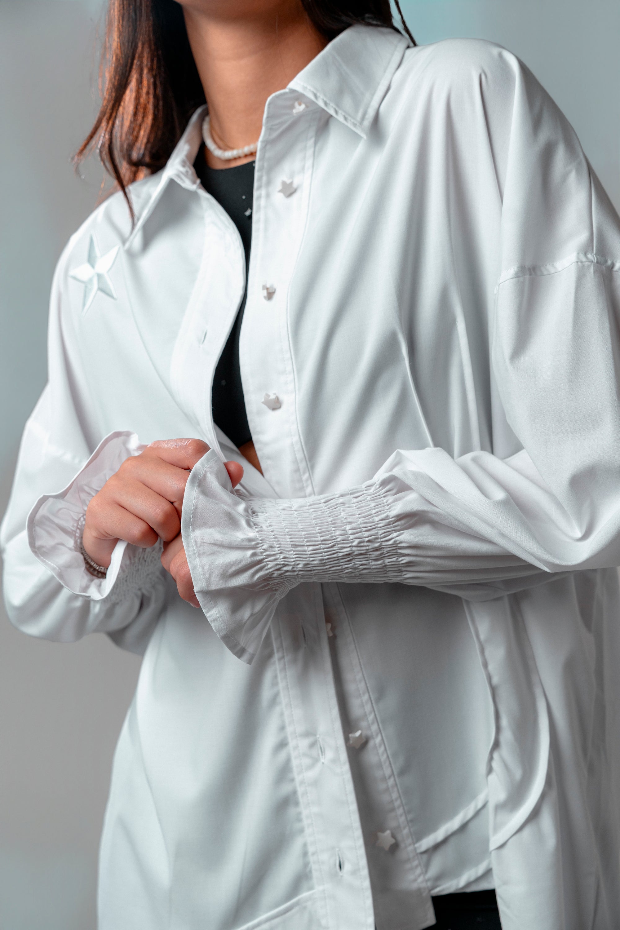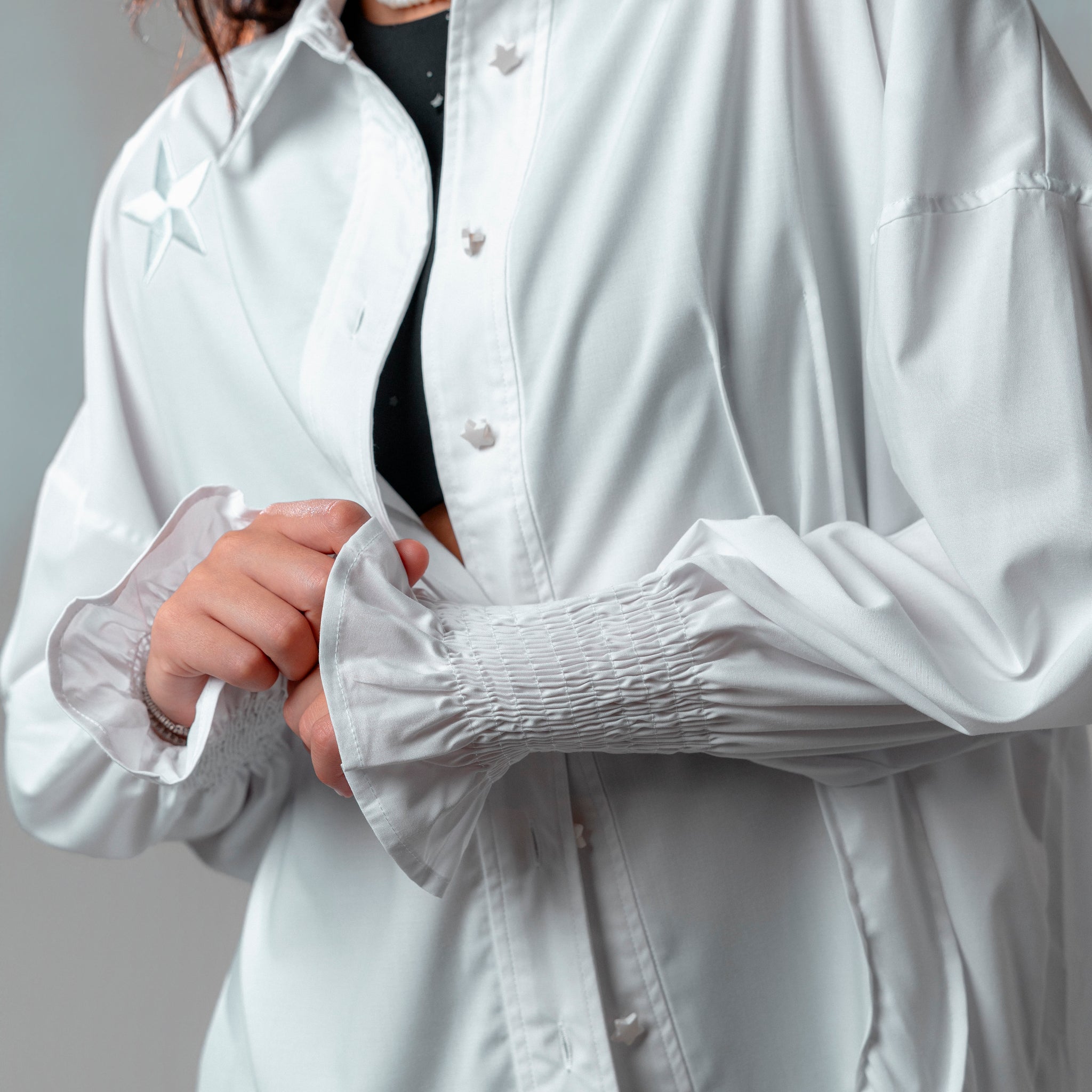 Where structure meets serenity. Crafted from a soft Lycra-cotton blend, The Starlane Shirt redefines everyday polish with its fluid curves, oversized fit, and celestial detailing. Star-shaped buttons trace its front placket, while delicate embroidery nods to Ink Martini’s signature cosmic aesthetic. Designed for movement yet effortlessly elevated this piece transitions seamlessly from laid-back days to statement evenings.
